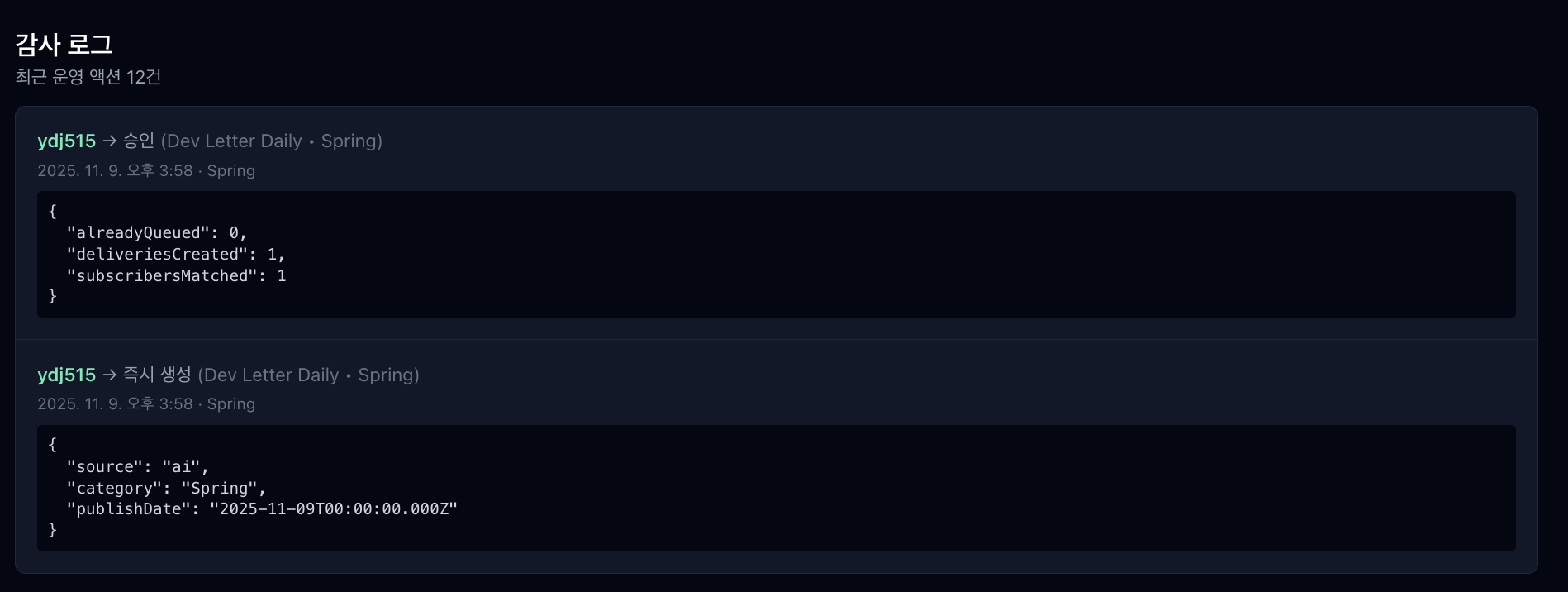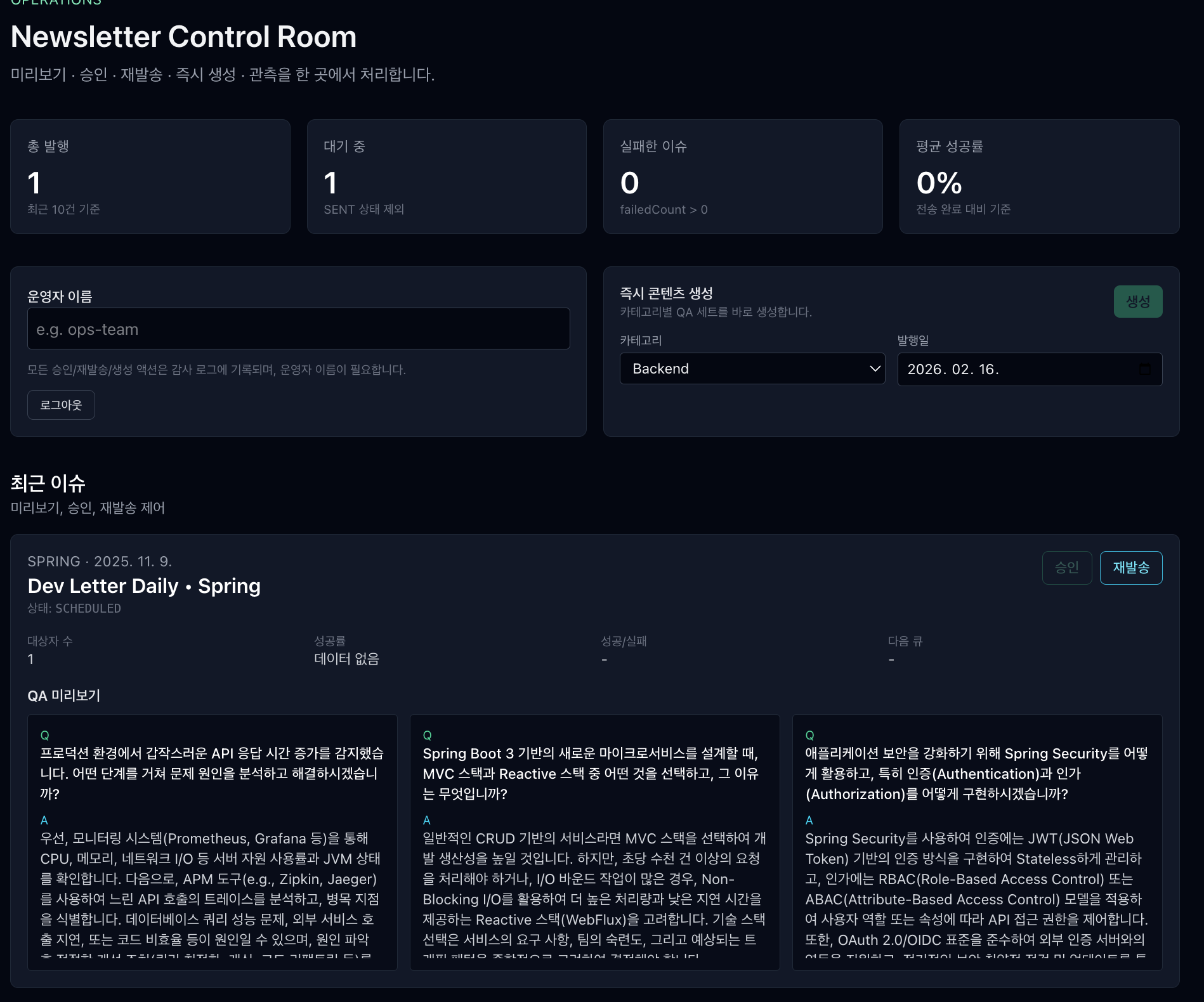오늘 AI가 쓴 글이 너무 별로라서 관리자가 업데이트를 직접할 수도 있게, 실제로 발송이 되었는지 체크할 수 있는 admin 페이지가 필요했습니다.