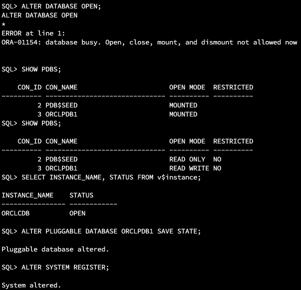 아래 순서로 CDB/PDB를 OPEN하고, 리스너에 서비스 등록하였습니다.