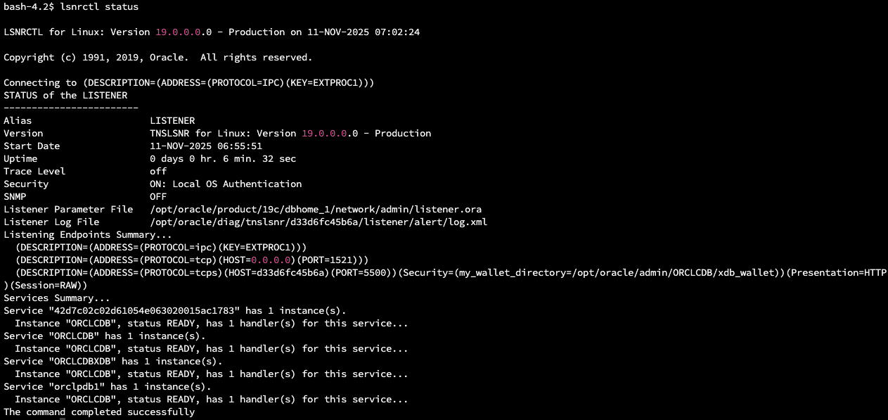 그 다음 컨테이너 셀에서 명령어로 리스너의 상태를 확인합니다.
